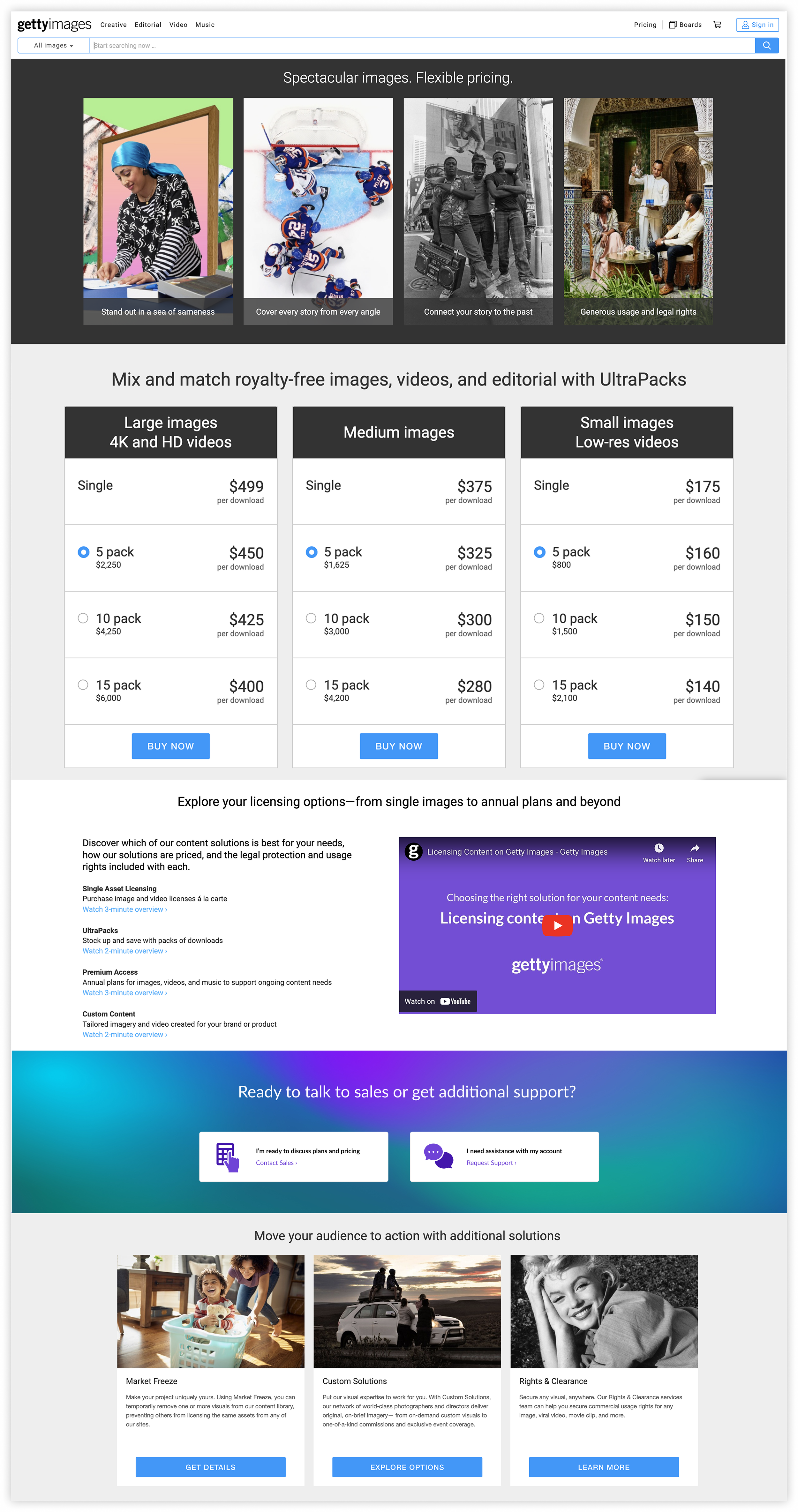 The pricing page currently features an outdated design and lacks an intuitive, user-friendly layout that effectively highlights Getty's full range of products. This results in missed opportunities to drive additional revenue, especially from Ultrapacks, which are prominently featured at the top of the page.
